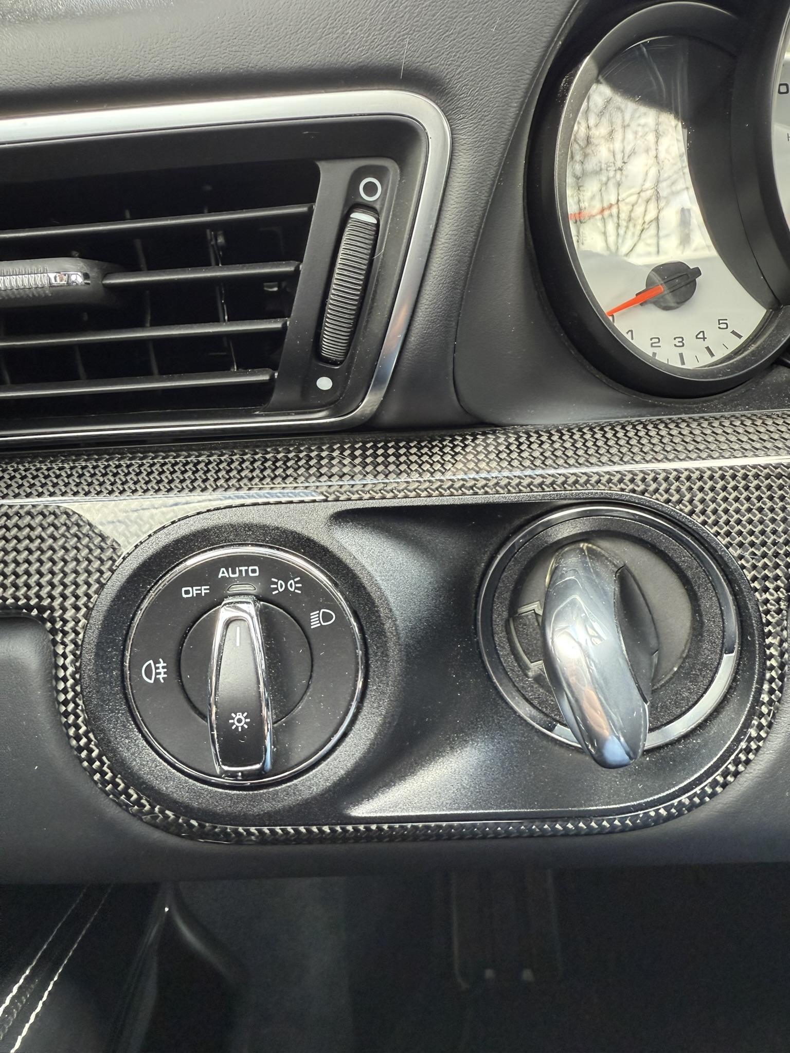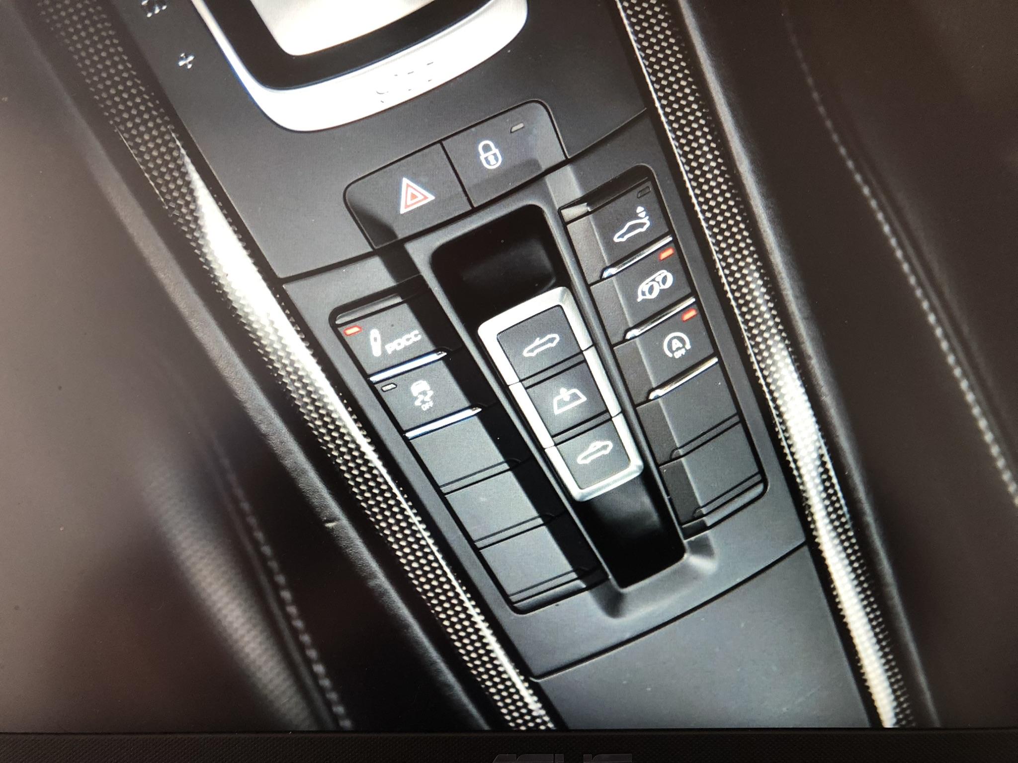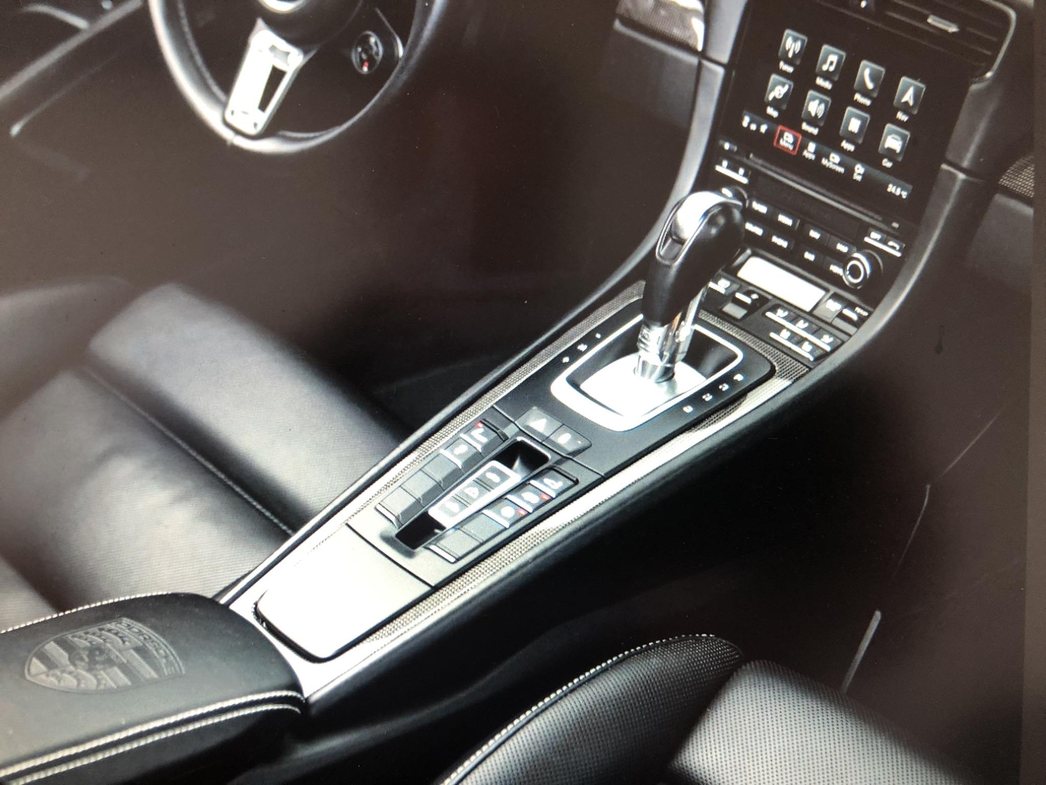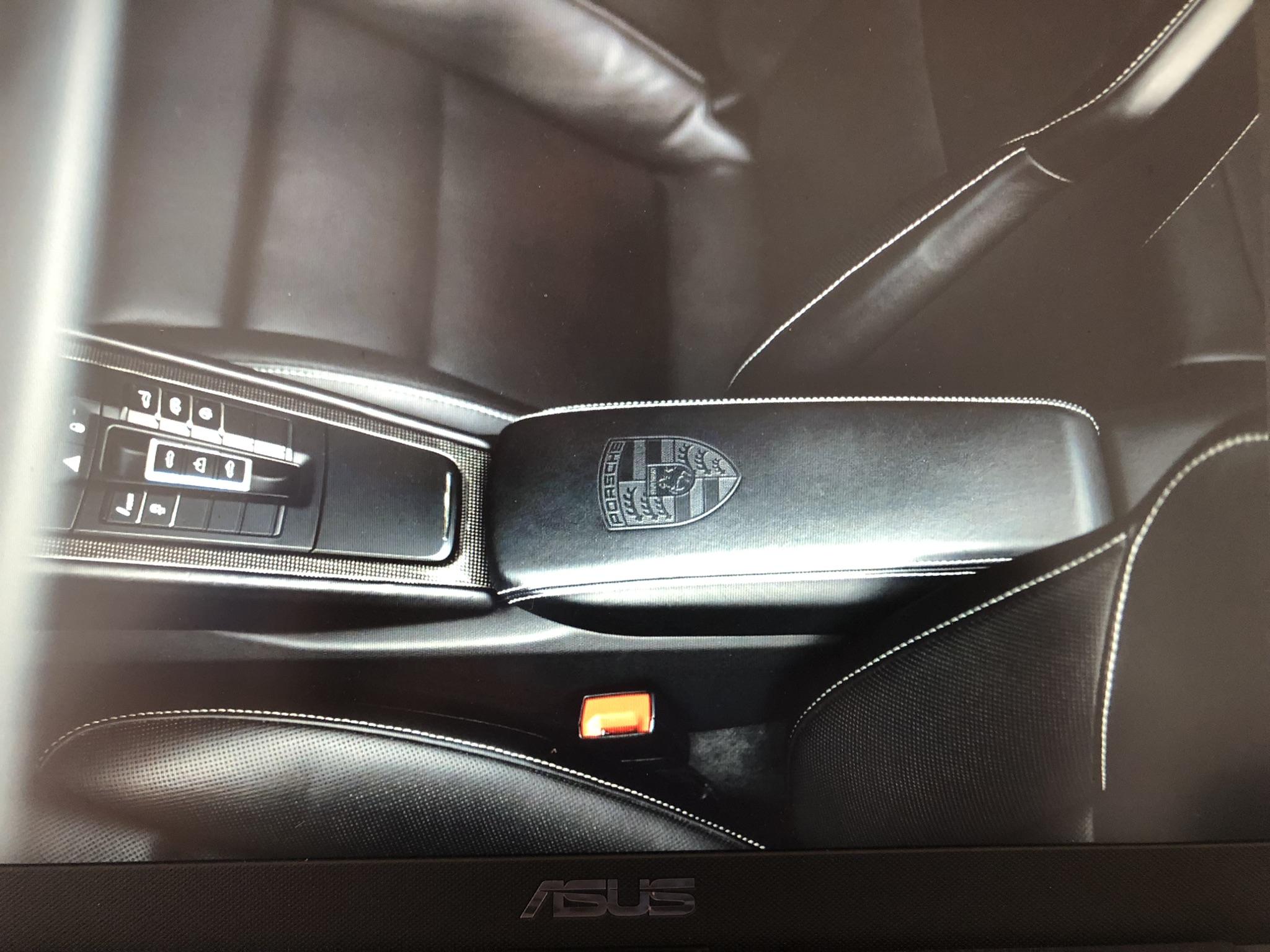 XPT MDA Ecusson Porsche sur le couvercle du coffre de rangement de la console centrale.